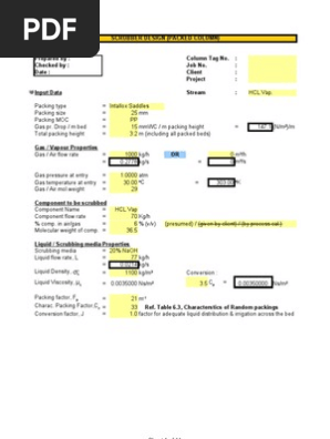 Site Tri-Mer engineers determine the optimum tower diameter packing depth recirculation flow rate and mist eliminator requirement in microns. η 1 e -kRsqrt ψ ---- 1 where. Spray tower scrubber design calculation xls. The safety valves discharge to the scrubber and the scrubber overhead vapor discharges to the flare system. The humidifying efficiency of the scrubber may be expressed as. The PackCol program performs hydraulic design and rating calculations for packed columns and towers. Just as fine particles in water colloids carry a charge of static electricity so do colloidal par-. Scrubbing media 20 NaOH. The optimum wet scrubber system has such design goals as maximum particulate collection low power consumption and low maintenance.