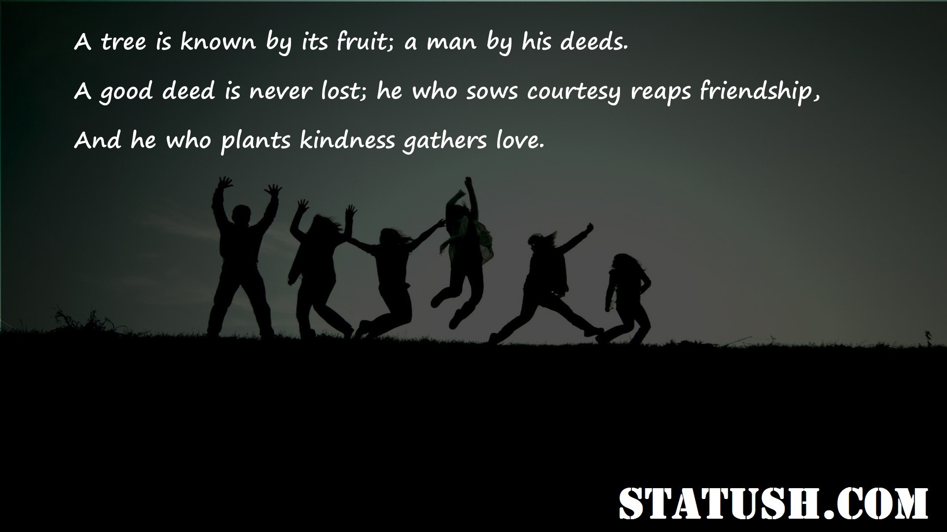 Every tree that does not bear good fruit is cut down and thrown into the fire. A man by his deeds. He who sows courtesy reaps friendship and he who plants kindness gathers love.