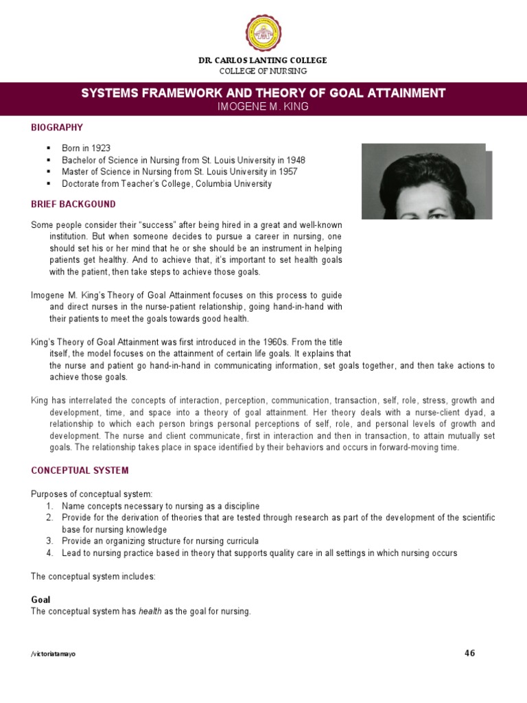The value of Kings Conceptual System is its ability to guide nursing practice. Nursing knowledge base King 1968. The basic concept of the theory is that the nurse and patient communicate information set goals together and then take actions to achieve those goals. The systematic use and validation of knowledge about concepts relevant to nursing situations. This theory helps a nurse set goals with a patient to ensure they become healthy. She developed a general systems framework and a theory of goal attainment where the framework refers to the three interacting systems - individual or personal group or interpersonal and society or social while the theory. 1968 In A Conceptual Frame of Reference for Nursing King began to argue that a theoretical body of knowledge was necessary for the advancement of nursing Introduced Concepts of Social Systems Health Interpersonal Relationships and Perceptions Developing a Theory.